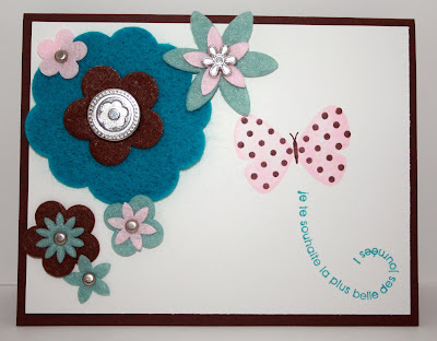 J’adore mes vacances… Je vous écrit vite aujourd’hui parce que je pars dans 5 minutes pour une excusion… Voici une carte faite avec une de mes techniques préférées utilisant la BigShot: utiliser de la feutrine…