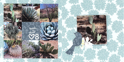 Vous aurez besoin simplement de quelques photos et papiers à motifs que vous pourrez couper en carrés de grandeur égale. Ensuite, vous confectionnez une jolie mosaïque. Ici, j’ai agencé le tout afin que les photos des cactus fassent le tour du titre. Mais on aurait pu alterner aléatoirement les photos et les papiers à motifs.